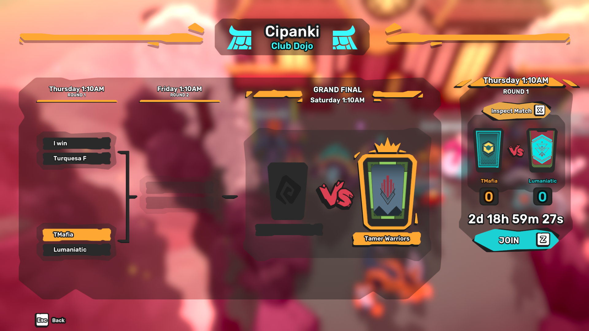 - Le Responsable ou les coresponsables doivent inscrire leur club le dimanche, et différentes rondes auront lieu du lundi au vendredi. Les Recrues doivent confirmer leur participation. Tout est sur la base du premier arrivé, premier servi. Veuillez noter que le club sera disqualifié de cette guerre de dojo si un nombre insuffisant de guerriers confirment leur participation. Les finales ont lieu le samedi.